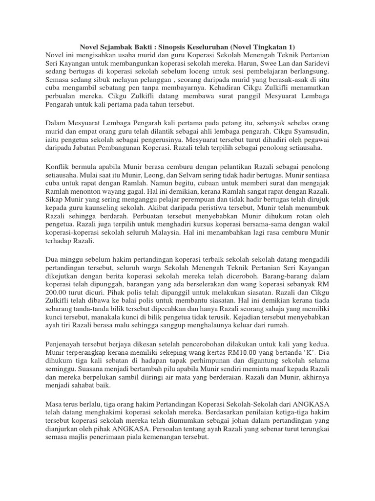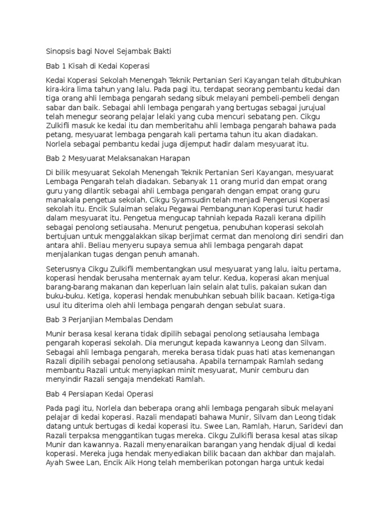 Sinopsis Bagi Novel Sejambak Bakti Doc Document from demo.vdocuments.net Berdasarkan novel sejambak bakti karya rejab fi, koperasi sekolah tersebut bercadang untuk menternak ayam telur. Sejambak bakti adalah sebuah cerita mengenai kegiatan dan perkembangan sebuah koperasi sekolah. Sinopsis bagi novel sejambak bakti. Contohnya, hati dan perasaannya macam emak juga; Usj komsas antologi kuingin berterima kasih & novel via www.oxfordfajar.com.my. Komponen sastera dan novel bm / bahasa melayu. Sinopsis, watak dan perwatakan, tema, persoalan, nilai, pengajaran, latar masa, latar tempat : Sample question + answer (10) →.